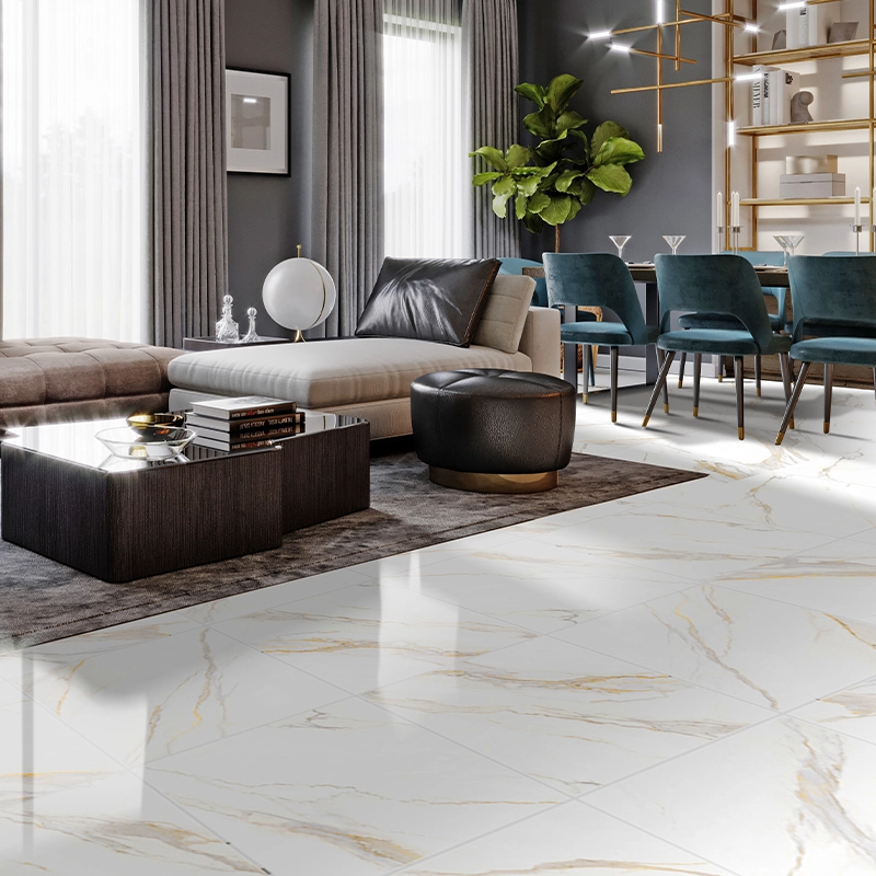 El porcelánico Carrara Gold reproduce la elegancia del mármol blanco con vetas doradas, creando espacios luminosos y distinguidos. Su acabado pulido refleja la luz y genera continuidad visual, aportando un estilo sofisticado tanto en proyectos residenciales como en espacios comerciales de alto nivel.